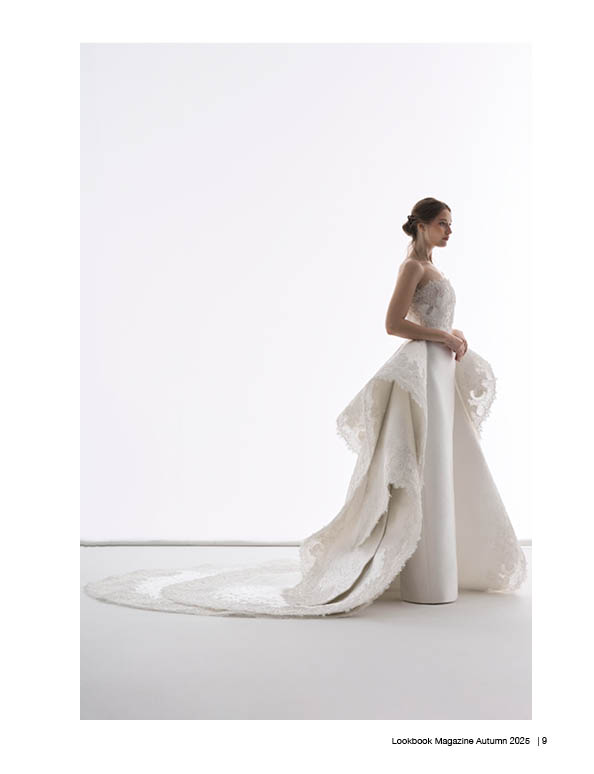 Each gown plays with contrasts, blending architectural tailoring and fluid draping. Sculptural cuts meet airy volumes, resulting in silhouettes that feel both modern and timeless. The fabric selection is deliberately focused: Mikado satin for structure, silk tulle for transparency and lightness, and fine lace for intricate surface detail. Hand embroidery, echoing floral and baroque motifs, enhances texture without overpowering the purity of the lines.